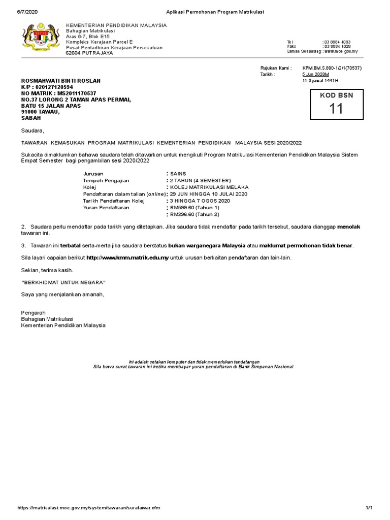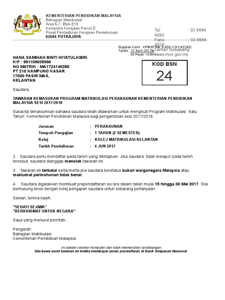 surat tawaran kolej matrikulasi